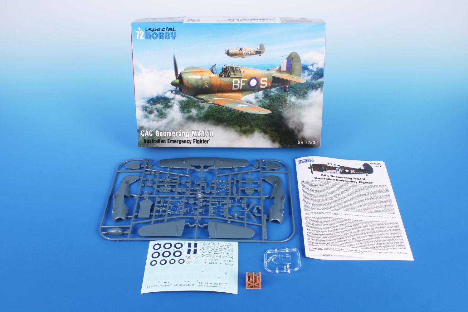 Injection moulded plastic kit with 3D printed parts for the interior and exterior of the 1/72 scale Boomerang fighter. The screen printed decal sheet covers five camouflage schemes; A46-126 Sinbad II of 5 Sqn; A46-121 Olga of 4 Sqn; A46-87 of 84 Sqn; A46-144 of 83 Sqn and A46-167 of 85 Sqn.There is a screen printed decal sheet and a full colour instruction booklet included.
